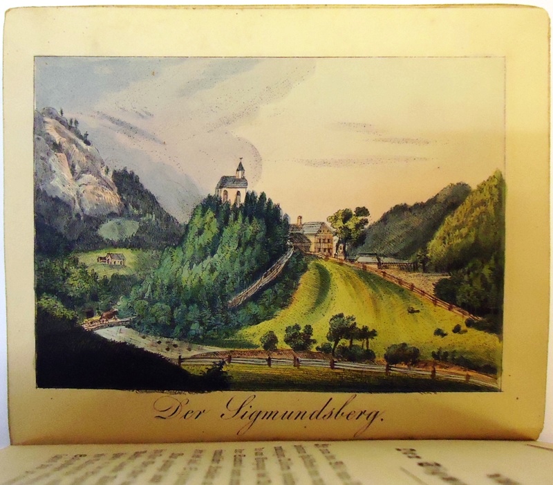 12°. Mit 20 farblithographierten Ansichten. 81 S., 3 Bl., Pappband mit aufkaschierten Orig.-Deckeln. – „Erinnerung und Andenken an Maria Zell. Eine kurze Beschreibung dieses Gnadenortes, Darstellung der Kirche, der Gnadenkapelle, der Schatzkammer und mehrerer Merkwürdigkeiten des Gebirgsfleckens, dann der Sigmundskapelle, des Holzaufzuges, des k.k. Gußwerkes, des Erlaf-Sees, des Wasserfalles zum todten Weibe und des Lasing-Wasserfalles aus den Umgebungen desselben“ (Langer Titel).